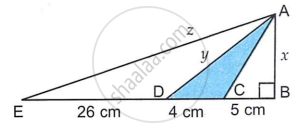 In ΔABE, C and D are points on EB. ∠B = 90°, BC = 5 cm, CD = 4 cm and DE = 26 cm. Area of ΔADC = 24 cm2. Find the length of x, y and z.