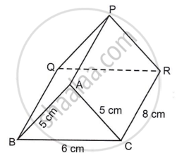 ABC is the cross-section of the prism. Find the surface area and volume of the prism if AB = AC = 5 cm, BC = 6 cm and CR = 8 cm.