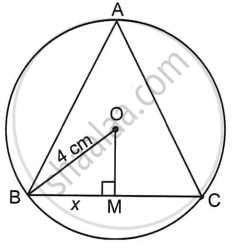 ABC is an equilateral triangle inscribed in a circle with centre 0. Radius OB = 4 cm, and OM is perpendicular to BC. Find x and the perimeter of the triangle.