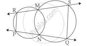 आकृती मध्ये, दोन वर्तुळे एकमेकांना बिंदू M व N मध्ये छेदतात. बिंदू M व N मधून काढलेल्या वृत्तछेदिका बिंदू R व S मध्ये, आणि बिंदू P व Q मध्ये छेदतात. तर रेख PR || रेख QS, हे सिद्ध करा.