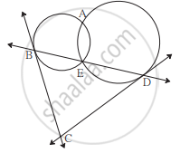 दोन वर्तुळे परस्परांना बिंदू A व E मध्ये छेदतात. बिंदू E मधून काढलेली त्यांची सामाईक वृत्तछेदिका वर्तुळांना बिंदू B व D मध्ये छेदते. बिंदू B व D मधून काढलेल्या स्पर्शिका एकमेकींना बिंदू C मध्ये छेदतात. सिद्ध करा : `square`ABCD चक्रीय आहे.