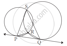 आकृती मध्ये दोन वर्तुळे परस्परांना बिंदू S व R मध्ये छेदतात. त्यांची रेषा PQ ही सामाईक स्पर्शिका त्यांना बिंदू P व Q मध्ये स्पर्श करते, तर सिद्ध करा - ∠PRQ + ∠PSQ = 180°