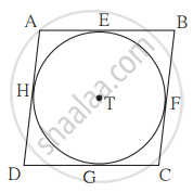 आकृती मध्ये, समांतरभुज `square`ABCD हा केंद्र T असलेल्या वर्तुळाभोवती परिलिखित केला आहे. (म्हणजे त्या चौकोनाच्या बाजू वर्तुळाला स्पर्श करतात.) बिंदू E, F, G आणि H हे स्पर्शबिंदू आहेत. जर AE = 4.5 आणि EB = 5.5, तर AD काढा.