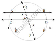 रेषा AB || रेषा CD || रेषा EF आणि रेषा QP ही त्यांची छेदिका आहे. जर y : z = 3 : 7 तर x ची किंमत काढा.