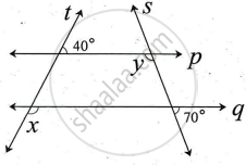 सोबतच्या आकृतीत रेषा p || रेषा q आहे. रेषा t व रेषा s या छेदिका आहेत. दिलेल्या मापांवरून ∠x व ∠y ची मापे काढा.