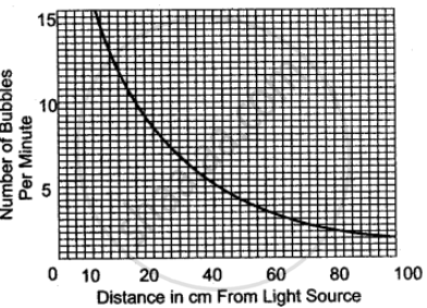 The diagram alongside refers to an experiment in which the apparatus was set up with the light source 10 cm away from the plant. After 15 minutes the number of bubbles evolved per minute from the cut stem was recorded. The light source was moved to 20 cm away from the plant, left for 15 minutes and the number of bubbles evolved per minute was again recorded. The experiment was repeated with the light source at distances of 40, 60, 80 and 100 cm away from the plant. Plot a graph for the results obtained and answer the following questions.