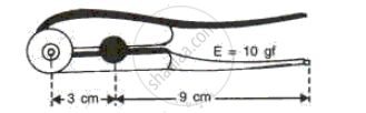 A pair of nut crackers is 12 cm long. An effort of 10 gf is required to crack a nut which is passed at a point 3 cm from the finger. Calculate the load Fig.