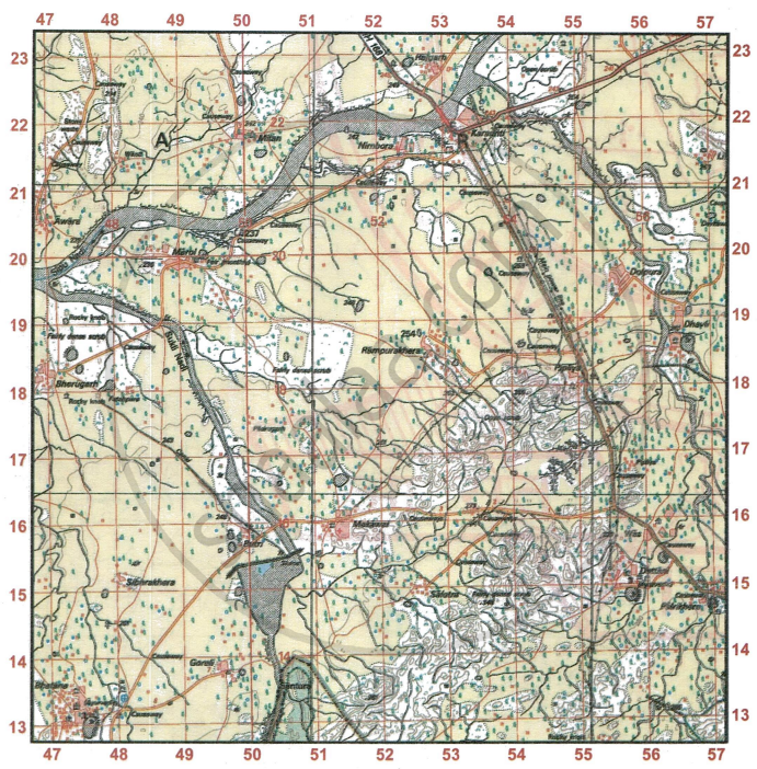 Study the extract of the Survey of India Map Sheet No. G43S10 and answer the following questions [Eastings 47-57, Northings 13-23]: