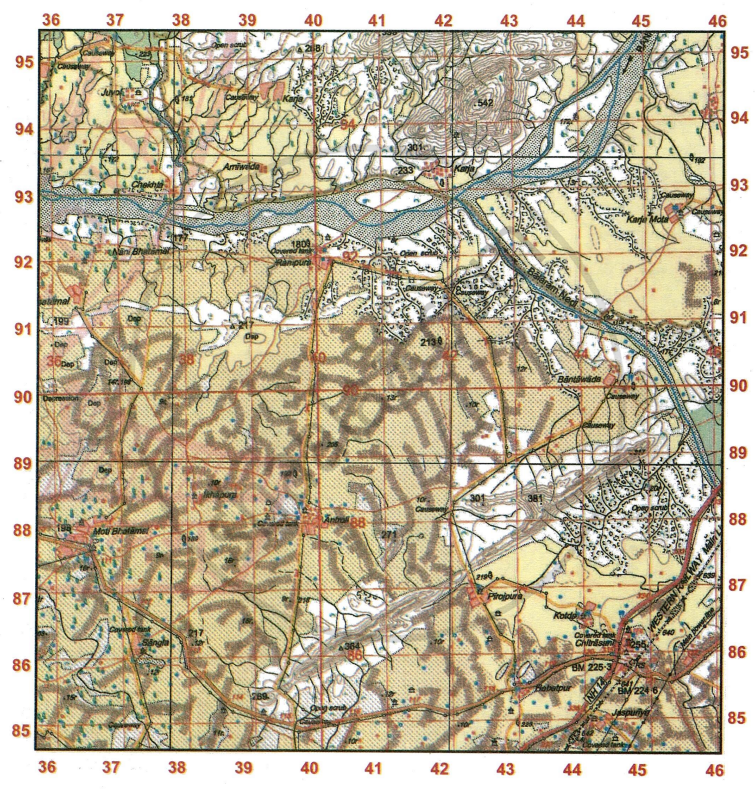 Study the extract of the Survey of India map Sheet No. G43S7 and answer the following questions: [Eastings 25-35, Northings 89-99]: