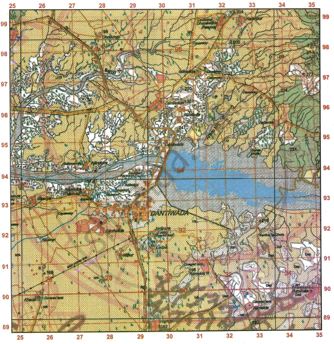 - Identify the type of road that runs from the Police Station at Dantiwada up to the settlement at Nandotra (Brahmanvas) (grid square 2794). For which purpose is this road used?