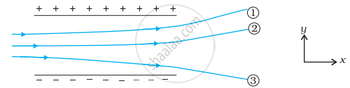 निचे दिए गए चित्र में किसी एकसमान स्थिर विद्युत-क्षेत्र में तीन आवेशित कणों के पथचिह्न (tracks) दर्शाए गए हैं। तीनों आवेशों के चिह्न लिखिए। इनमें से किस कण का आवेश-संहति अनुपात `("q"//"m")` में अधिकतम है?