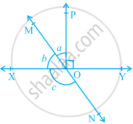 In the given figure, lines XY and MN intersect at O. If ∠POY = 90° and a : b = 2 : 3, find c.