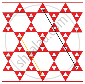 Given figure is a floor design in which the length of the small red equilateral triangle is 30 cm. All the triangles and hexagons are regular. Describe the translations in cm, represented by the (i) yellow line (ii) black line (iii) blue line