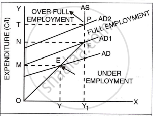 | Stage 4: Over-full Employment | If investment increases further, AD shifts to AD₂, intersecting AS at point P. Since the economy is already at full employment, output cannot increase further — only prices rise. | Point P, above full employment |