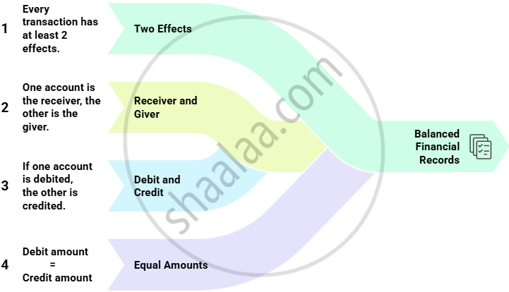 1. Dual Effect Every transaction affects at least two accounts: one debit and one credit. This maintains the accounting equation (Assets = Liabilities + Equity) and ensures balance in the books.