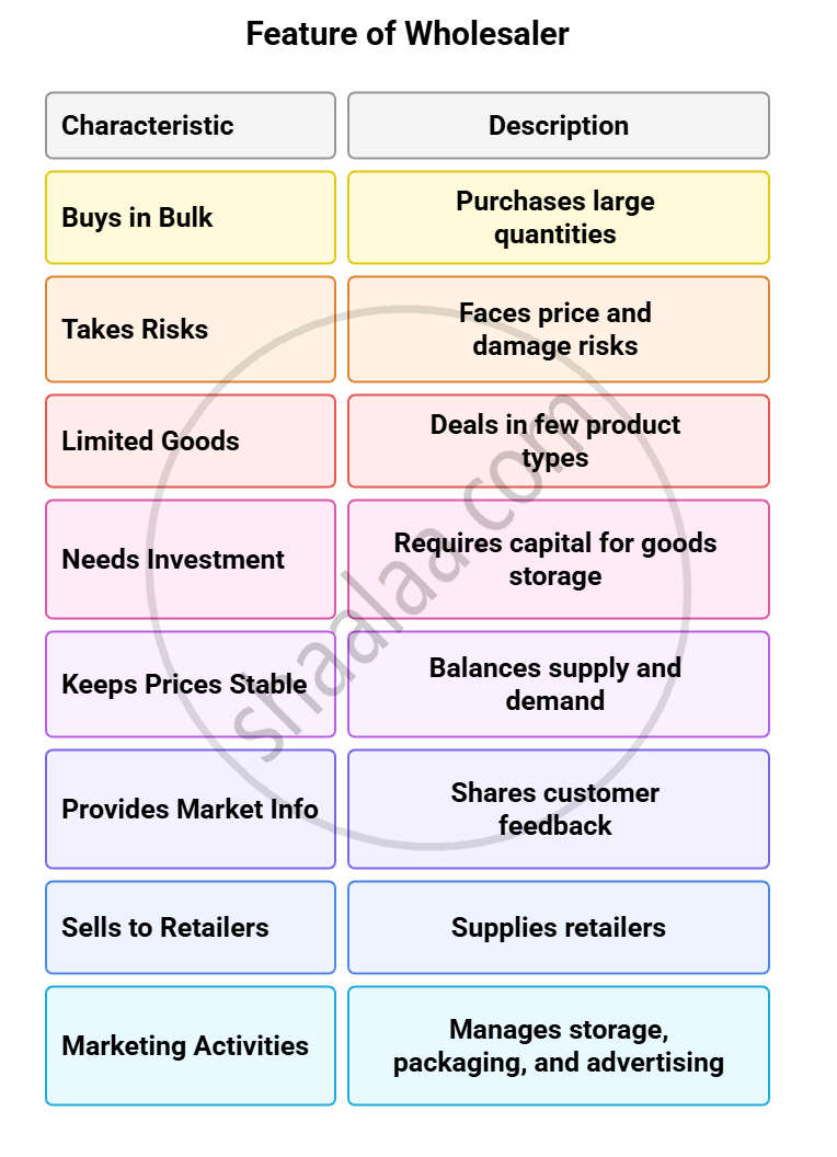 - Risk Bearing: Handle risks like price changes and stock storage.