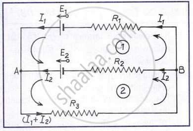 Consider the circuit shown, containing two cells of emfs E1 and E2 and three resistances R1, R2, and R3. Let the currents in R1 and R2 be I1 and I2, respectively. Applying Kirchhoff’s first law at junction A, the current through R3 is I1 + I2.