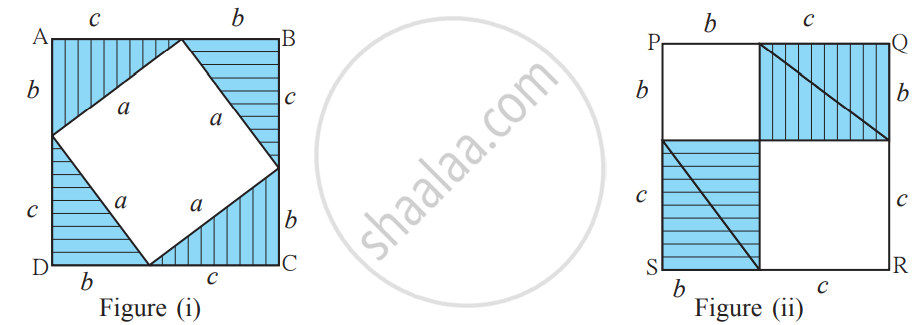 Observe the figures. In figure (i) we can see a square of side a units in the uncovered portion of square ABCD. In figure (ii) we see a square of side b and another of side c in the uncovered portion of the square PQRS.