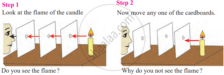 In Step 1, when the holes in the cardboard are perfectly aligned, you can see the flame because light travels in straight lines and passes through the aligned holes directly to your eye.