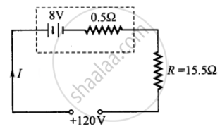 8 V विद्युत वाहक बल की एक संचायक बैटरी जिसका आंतरिक प्रतिरोध 0.5 Ω है, को श्रेणीक्रम में 15.5 Ω के प्रतिरोधक का उपयोग करके 120 V के D.C. स्रोत द्वारा चार्ज किया जाता है। - Physics (भौतिक विज्ञान)
