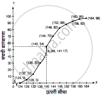 हम Y-निर्देशांक में y = 48 लेते हैं और X-अक्ष के समानांतर एक रेखा खींचते हैं, जो वक्र को A पर मिलती है और बिंदु A से X-अक्ष पर एक लंबवत रेखा खींचते हैं और यह रेखा माध्यिका है अर्थात माध्यिका = 141.17।