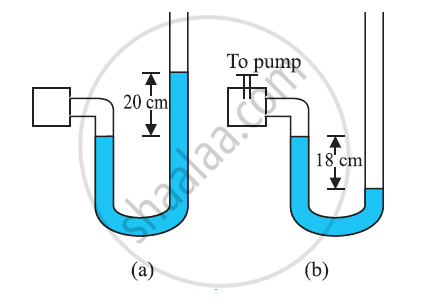 A manometer reads the pressure of a gas in an enclosure as shown in Figure (a) When a pump removes some of the gas, the manometer reads as in Figure (b) The liquid used in the manometers is mercury and the atmospheric pressure is 76 cm of mercury.