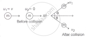 `1/2 "mv"^2 + 1/2 "m"(0)^2 = 1/2"mv"_1^2 + 1/2 "mv"_2^2`