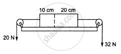 In the following figure shows a uniform rod of length 30 cm and mass 3.0 kg. The strings shown in the figure are pulled by constant forces of 20 N and 32 N. Find the force exerted by the 20 cm part of the rod on the 10 cm part. All the surfaces are smooth and the strings and the pulleys are light.