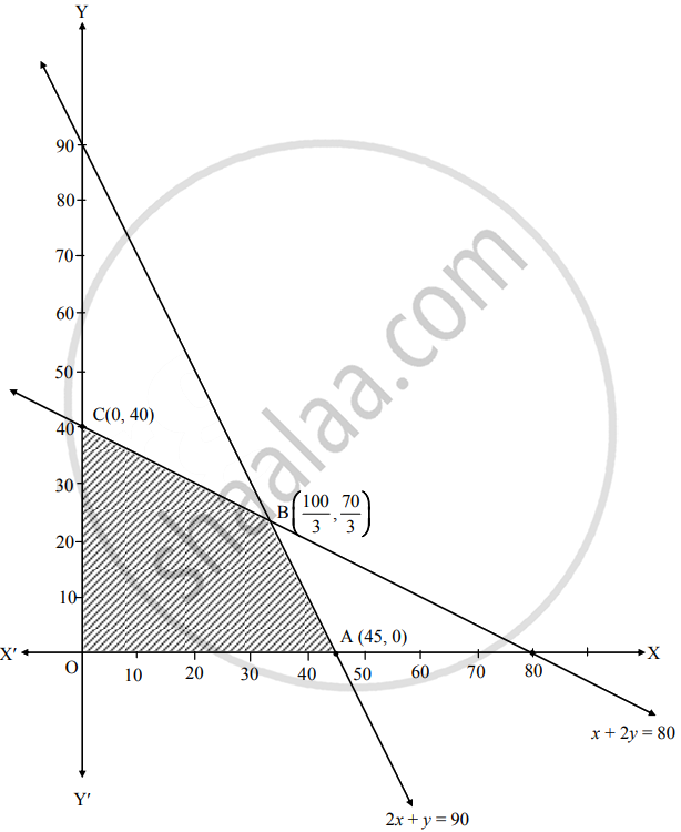 Shaded portion OABC is the feasible region, whose vertices are O(0, 0), A(45, 0), B and C(0, 40).