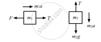 A constant force F = m2g/2 is applied on the block of mass m1 as shown in the following figure. The string and the pulley are light and the surface of the table is smooth. Find the acceleration of m1.