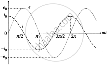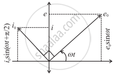 The phasor representing the peak emf (e0) makes an angle wt in an anticlockwise direction with respect to the horizontal axis. As the current leads the voltage by 90°, the phasor representing the peak current (i0) is turned 90° anticlockwise with respect to the phasor representing emf e0. The projections of these phasors on the vertical axis give instantaneous values of e and i.