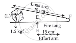 A fire tongs has arms 20 cm long. It is used to lift a coal of weight 1.5 kgf by applying an effort at a distance 15 cm from the fulcrum. Find: