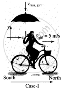 A girl riding a bicycle with a speed of 5 m/s towards north direction, observes rain falling vertically down. If she increases her speed to 10 m/s, rain appears to meet her at 45° to the vertical. - Physics