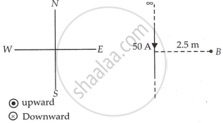 A long straight wire in the horizontal plane carries a current of 50 A in north to south direction. Give the magnitude and direction of B at a point 2.5 m east of the wire.