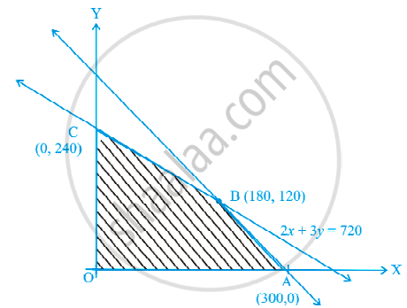 Subject to the constraints: `{:(x + y ≤ 300),(2x + 3y ≤ 720),(x ≥ 0"," y ≥ 0):}}`