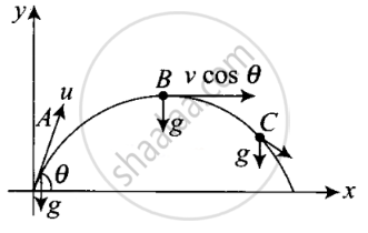 A particle is projected in air at some angle to the horizontal, moves along parabola as shown in figure, where x and y indicate horizontal and vertical directions, respectively. Show in the diagram, direction of velocity and acceleration at points A, B and C.
