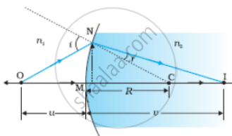 The figure shows the geometry of the formation of the image I of an object O on the principal axis of a spherical surface with center of curvature C, and radius of curvature R. The rays are incident from a medium of refractive index n1, to another of refractive index n2. As before, we take the aperture (or the lateral size) of the surface to be small compared to other distances involved, so that small angle approximation can be made. In particular, NM will be taken to be nearly equal to the length of the perpendicular from the point N on the principal axis.