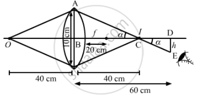 A point object O is placed on the principal axis of a convex lens of focal length f = 20 cm at a distance of 40 cm to the left of it. The diameter of the lens is 10 cm. An eye is placed 60 cm to right of the lens and a distance h below the principal axis. The maximum value of h to see the image is