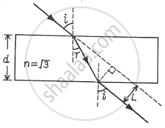 A ray of light is incident at an angle of incidence of 60° on the glass slab of refractive index `sqrt3`. After refraction the light ray emerges out from other parallel faces and the lateral shift between the incident ray and emergent ray is `4/sqrt3` cm. The thickness of the glass slab is ..........