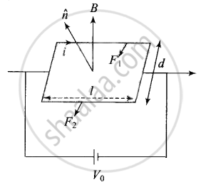 A rectangular conducting loop consists of two wires on two opposite sides of length l joined together by rods of length d. The wires are each of the same material but with cross-sections differing by a factor of 2. The thicker wire has a resistance R and the rods are of low resistance, which in turn are connected to a constant voltage source V0. The loop is placed in uniform a magnetic field B at 45° to its plane. Find τ, the torque exerted by the magnetic field on the loop about an axis through the centres of rods.