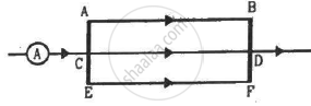 Figure shows a part of an electric circuit. The wires AB, CD and EF are long and have identical resistance. The separation between the neighbouring wires is 1.0 cm. The wires AE and BF have negligible resistance and the ammeter reads 30 A. Calculate the magnetic force per unit length of AB and CD.