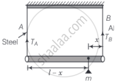 A rod of length l and negligible mass is suspended at its two ends by two wires of steel (wire A) and aluminium (wire B) of equal lengths (Figure). The cross-sectional areas of wires A and B are 1.0 mm2 and 2.0 mm2, respectively.