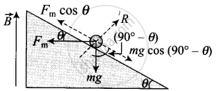 This makes flow of induced current `i = (v(B cos theta)d)/R` where R is the resistance of rod. Now, current carrying rod experience a magnetic force which is given by `F_m = iBd` (horizontally in backwards direction). Now, the component of magnetic force parallel to the inclined plane in upward direction