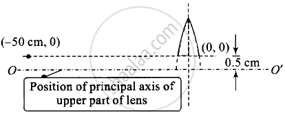 A thin convex lens of focal length 25 cm is cut into two pieces 0.5 cm above the principal axis. The top part is placed at (0, 0) and an object placed at (– 50 cm, 0). Find the coordinates of the image.