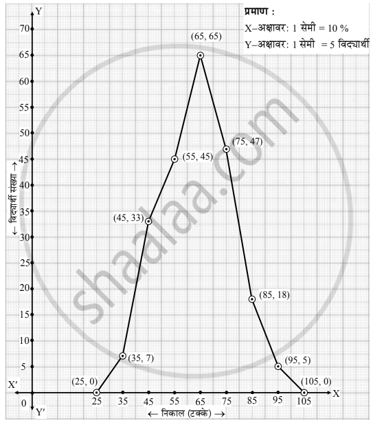 एका परीक्षेच्या निकालाच्या टक्केवारीचे वर्ग आणि त्या वर्गात असणारी विद्यार्थी संख्या खालील सारणीत दिली आहे. या सारणीवरून आयतालेख न काढता वारंवारता बहुभुज काढा: