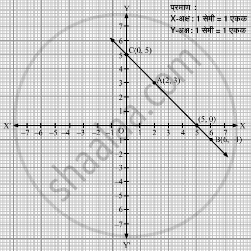 आलेखावरून असे दिसून येते की रेषा X-अक्षाला (5, 0) येथे आणि Y-अक्षाला (0, 5) येथे छेदते.