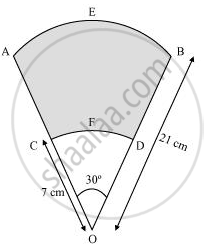 AB and CD are respectively arcs of two concentric circles of radii 21 cm and 7 cm and centre O (see the given figure). If ∠AOB = 30°, find the area of the shaded region. [Use Π = 22/7]