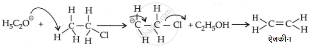 दूसरी ओर KOH के ऐल्कोहॉली विलयन में ऐल्कॉक्साइड (RO–) आयन होते हैं जो OH– से प्रबल क्षार होने के कारण सरलतापूर्वक ऐल्किल क्लोराइड से HCl अणु का विलोपन करके ऐल्कीन बना लेते हैं।