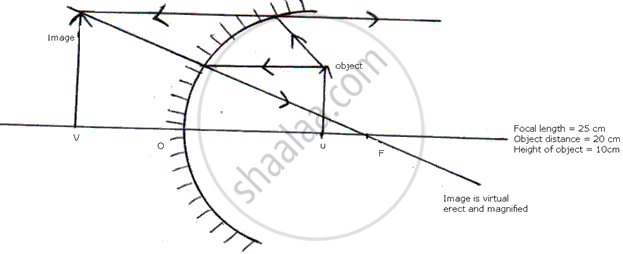 An object 10 cm high is placed at a distance of 20 cm in front of a spherical mirror of focal length 25 cm. By scale drawing find the nature, position, and magnification of the image in the following case: