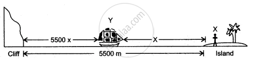 An observer X is on an island 5500 m from a vertical cliff on the shore. A ship Y is anchored between the island and the Cliff. A blast on the ship’s siren is heard twice by X, the interval being 5s. [Velocity of sound = 330 ms−1]